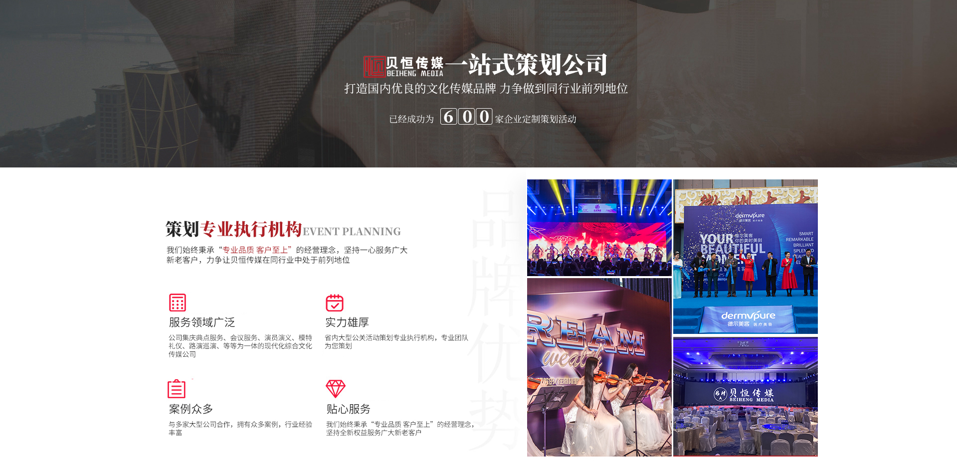 - 合 肥 貝 恒 文 化 傳 媒 專注·專業(yè)·專心·效率 合肥貝恒文化傳媒有限公司2017年成立于安徽·合肥,是省內(nèi)大型公關(guān)活動策劃專業(yè)執(zhí)行機(jī)構(gòu),公司集慶典服務(wù)、會議服務(wù)、演員演藝、模特禮儀、路演巡演、展會特裝、廣告制作、設(shè)備租賃、舞美策劃、企業(yè)形象宣傳等為一體的現(xiàn)代化綜合文化傳媒公司,我們始終秉承“專業(yè)品質(zhì)客戶至上”的經(jīng)營理念,堅持全...